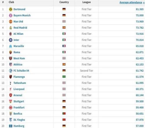 从最新的本赛季场均观众排名来看,大连英博场均57978人的数据能排进亚洲前20名,亚洲范围内更是遥遥领先。即使放到世界第一联赛英超当中,也只有5支球队能超越大连英博,也就是说,能排进英超本赛季上座人数前6名,确实让人叹为观止。