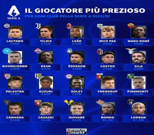 德转更新后意甲20家俱乐部身价最高球员: