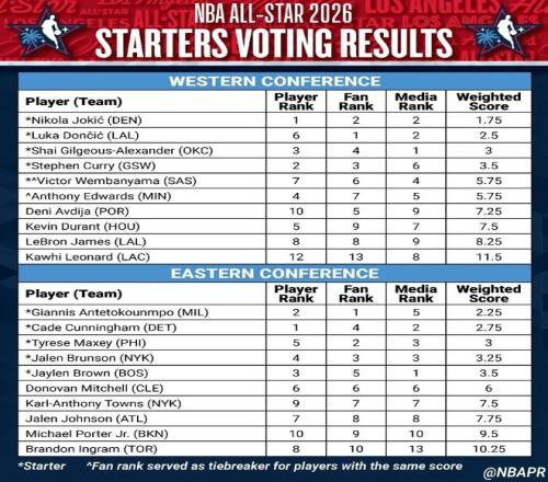 东西部五名首发球员由球迷(50%选票)、现役NBA球员(25%选票)和媒体(25%选票)共同选出: