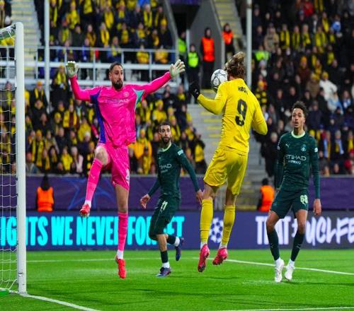 第22分钟,阿莱恩的逼抢太过冒失轻易被过掉,博德闪耀的反击以少打多,布隆伯格被胡桑诺夫撞倒,但他迅速起身传中,曼城后点漏人,霍格的头球顶穿了多纳鲁马的小门,主队意外取得领先。